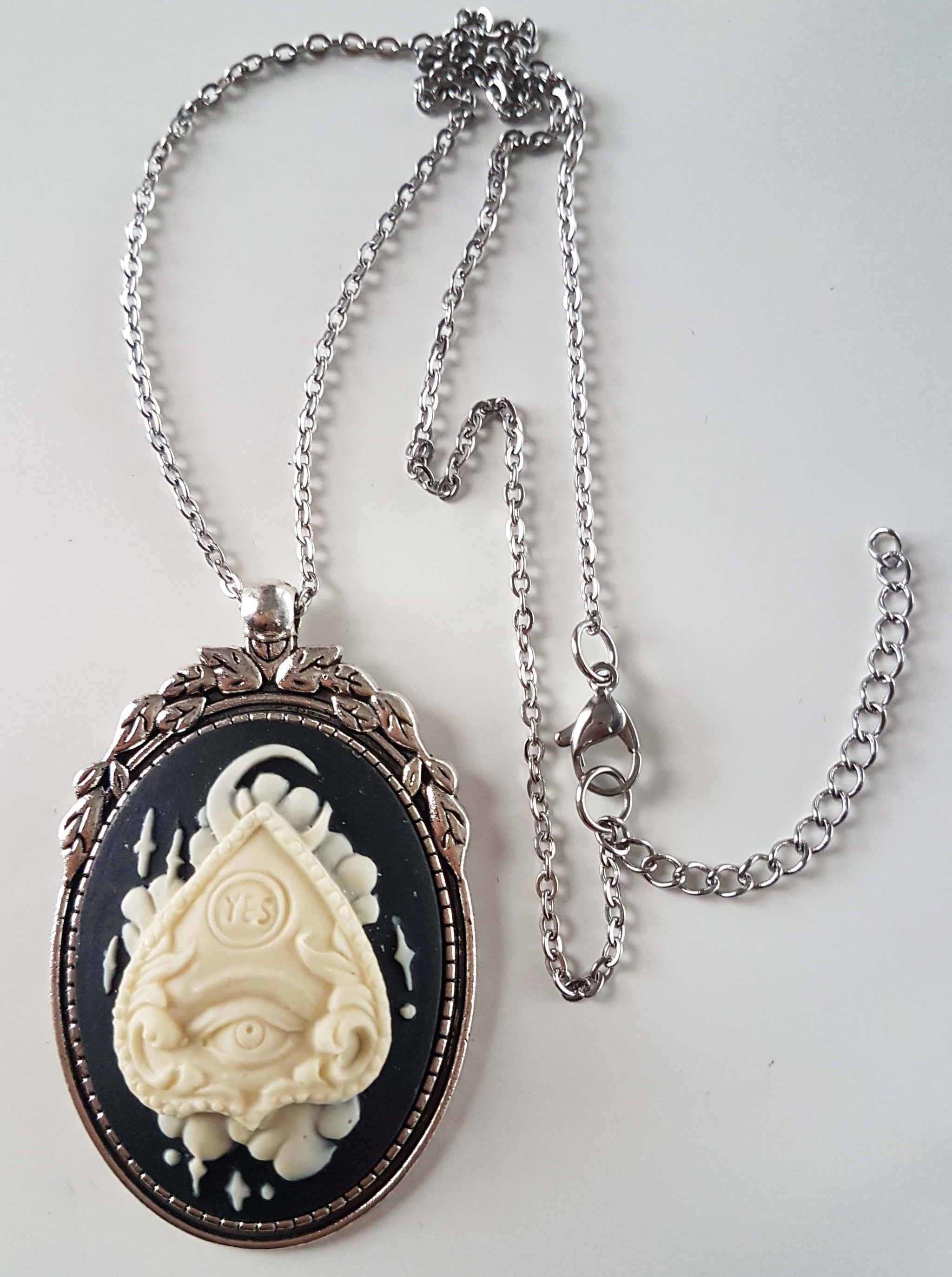 Inspired by the Occult and Witchcraft, this bewitching necklace features a large oval pendant with a highly detailed ouija planchette cameo.