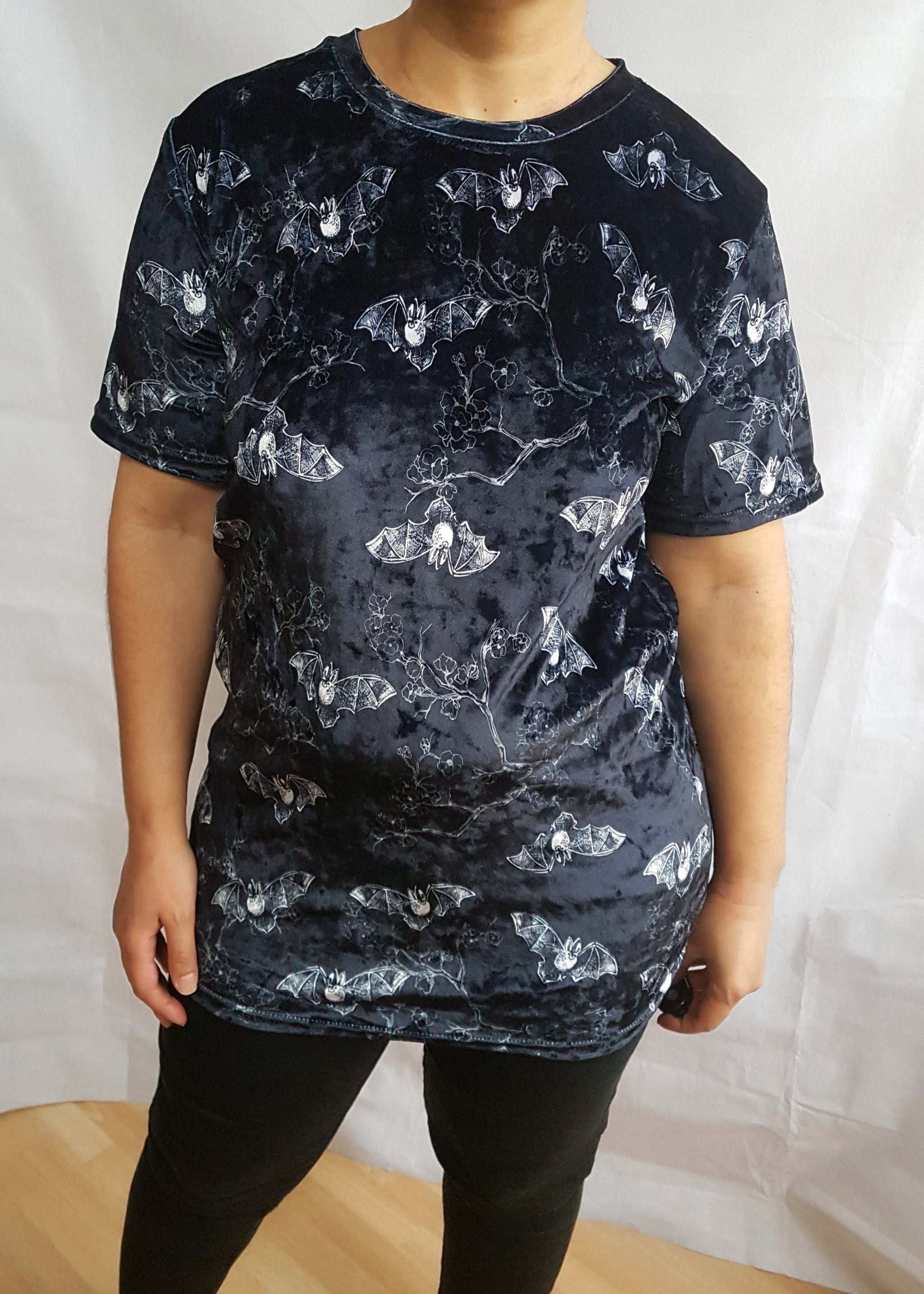 Add a sweet touch of darkness to your black wardrobe with this black velvet tshirt. Long enough to be worn over your leggings or tucked in for a smarter look. The print features a midnight scene of adorable flying bats against a delicate background of tree branches and blossoms.