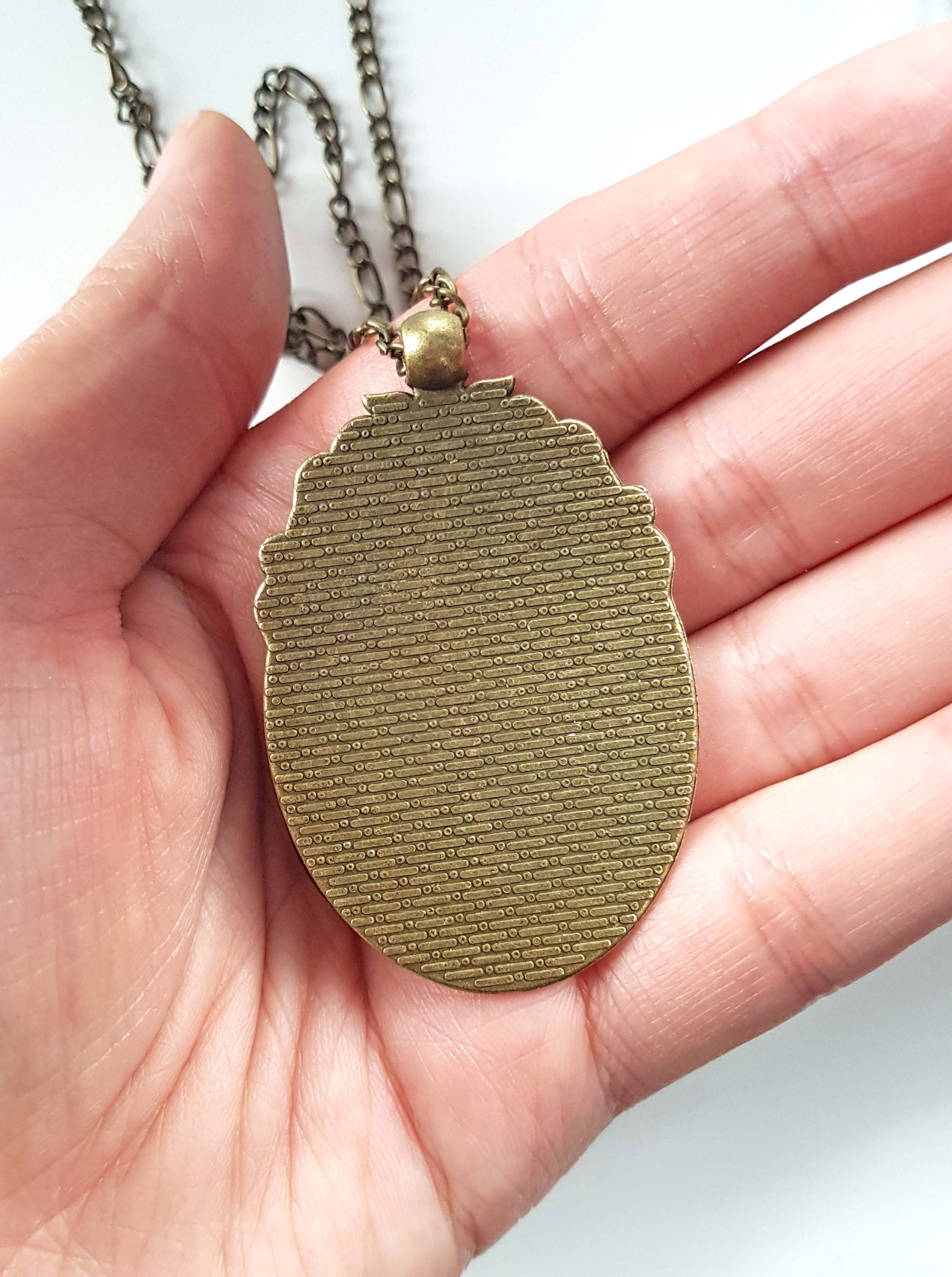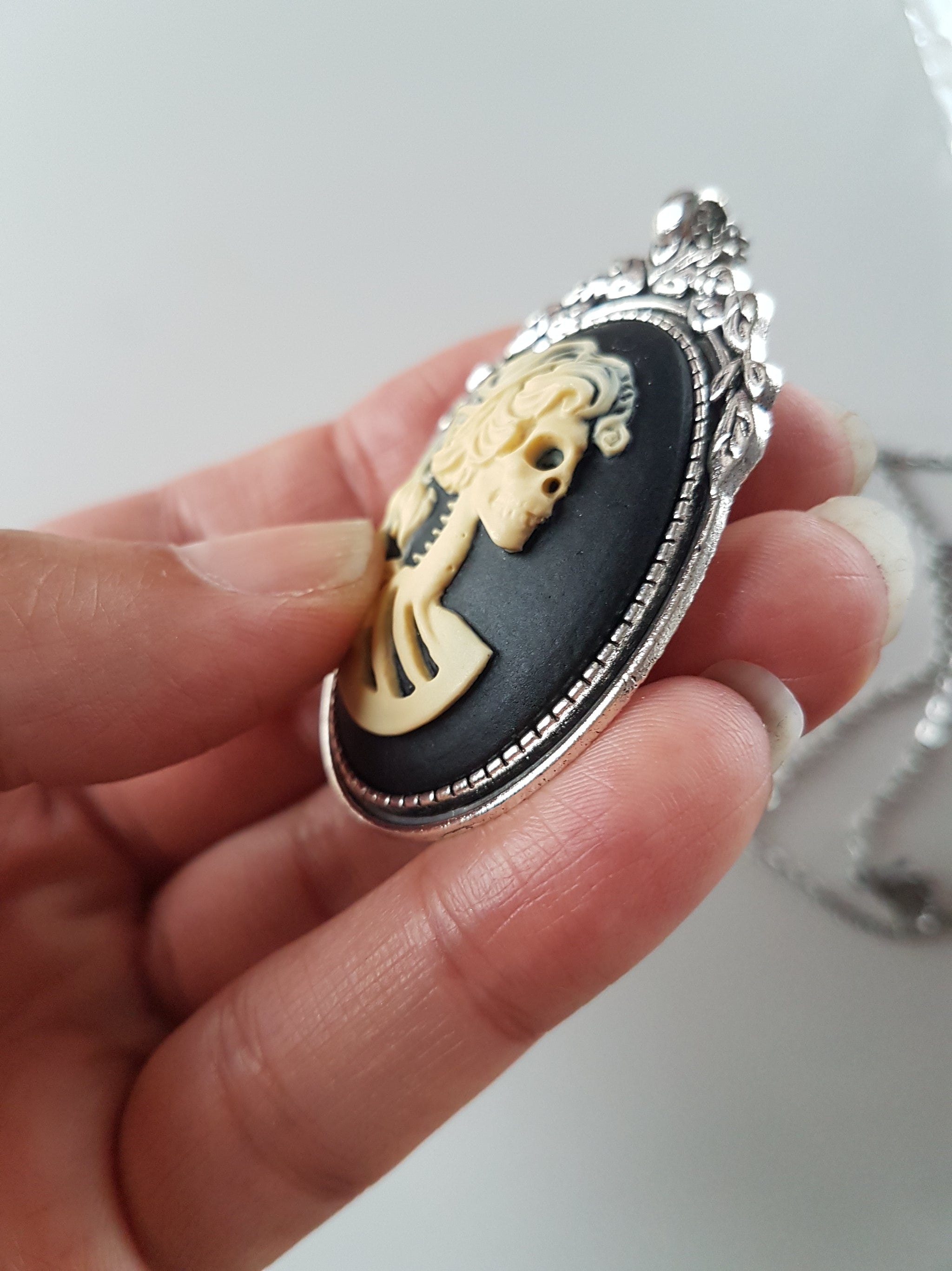 Featuring a large ornate pendant with a ghostly lady skull skeleton figure, this spooky and elegant Gothic cameo necklace is very lightweight and full of detail.