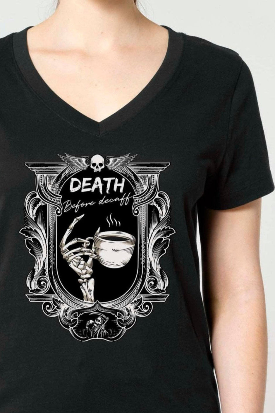 Super soft, v-neck tshirt featuring darkly elegant design with the slogan "Death before decaff" above a skeleton hand holding a cup of coffee and a tiny jack-the-ripper figure drinking from a cup.