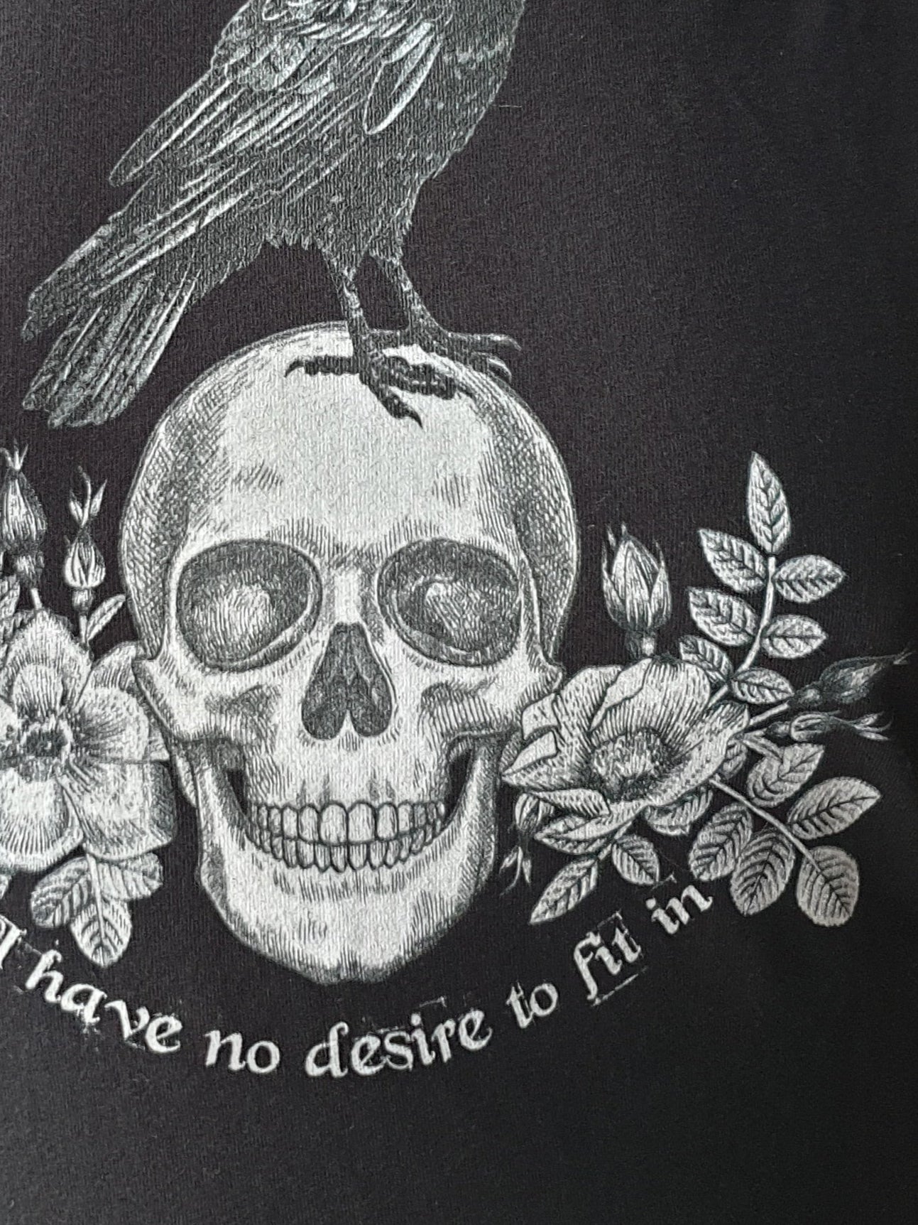 This soft, V-neck tshirt features a crow/raven perched on a skull alongside the message: “I have no desire to fit in.”