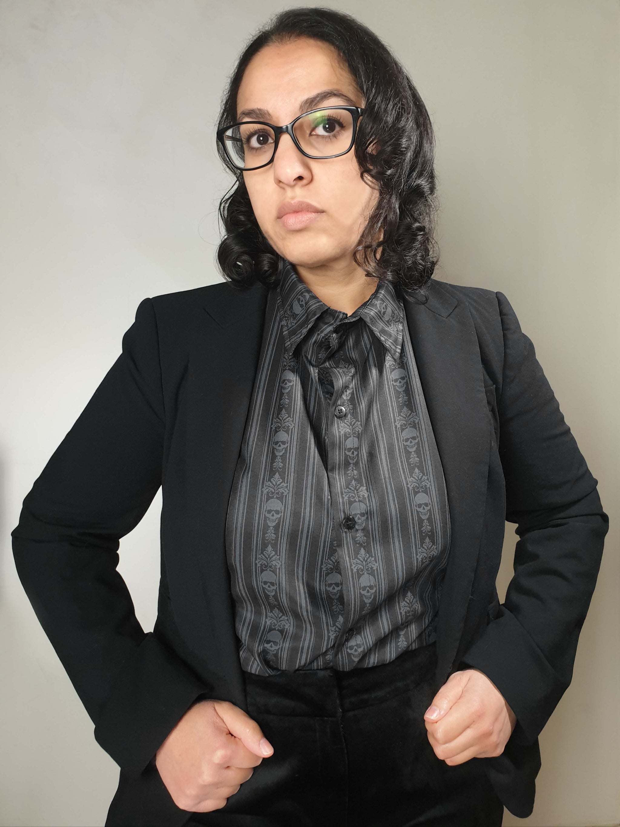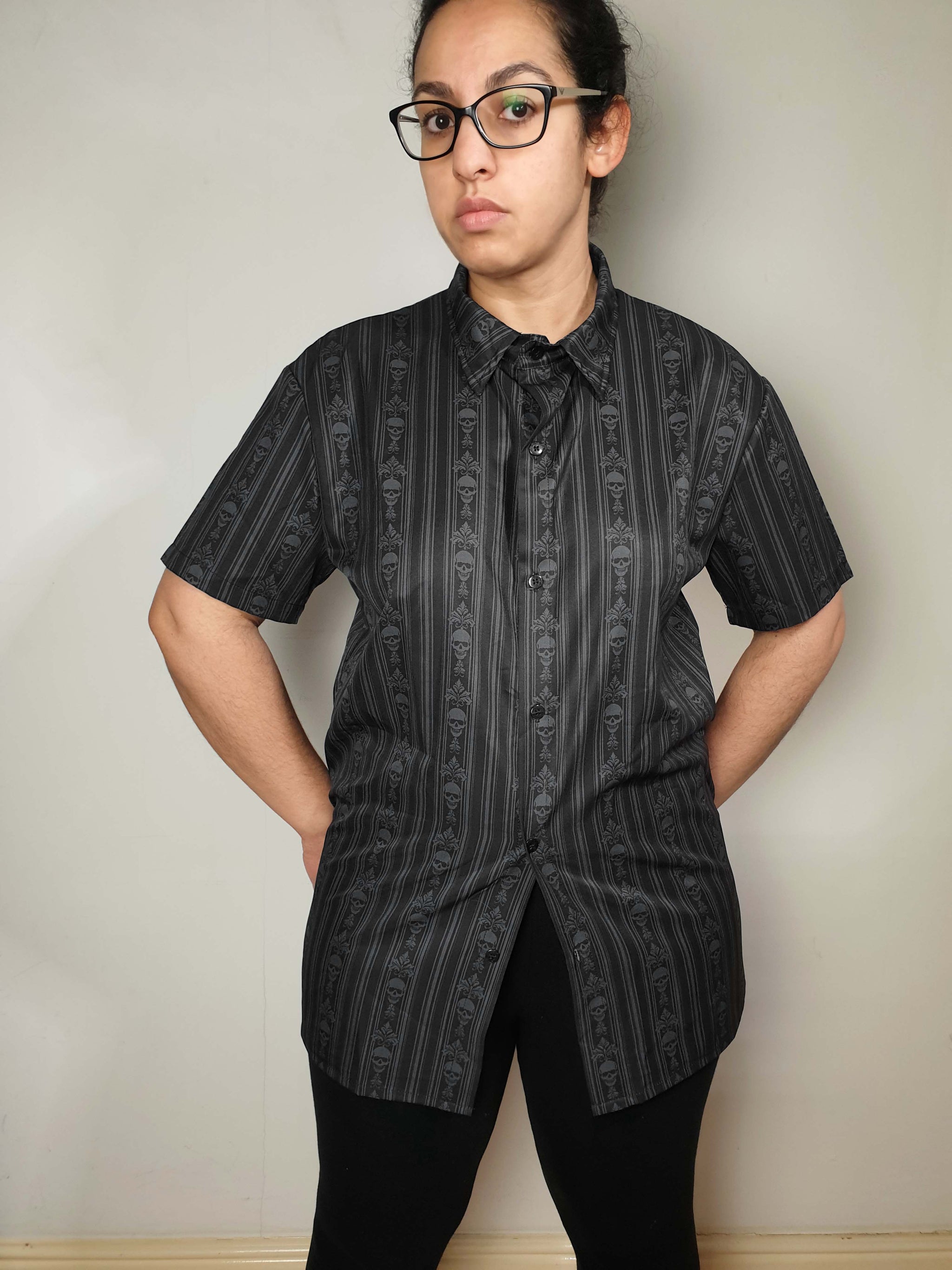 This short-sleeve collared shirt is made from soft, flowy fabric and showcases a stunning Baroque Skull Stripes print. It can be worn casually with leggings for a relaxed vibe, or tucked into bottoms for a more refined, corporate-Goth look.