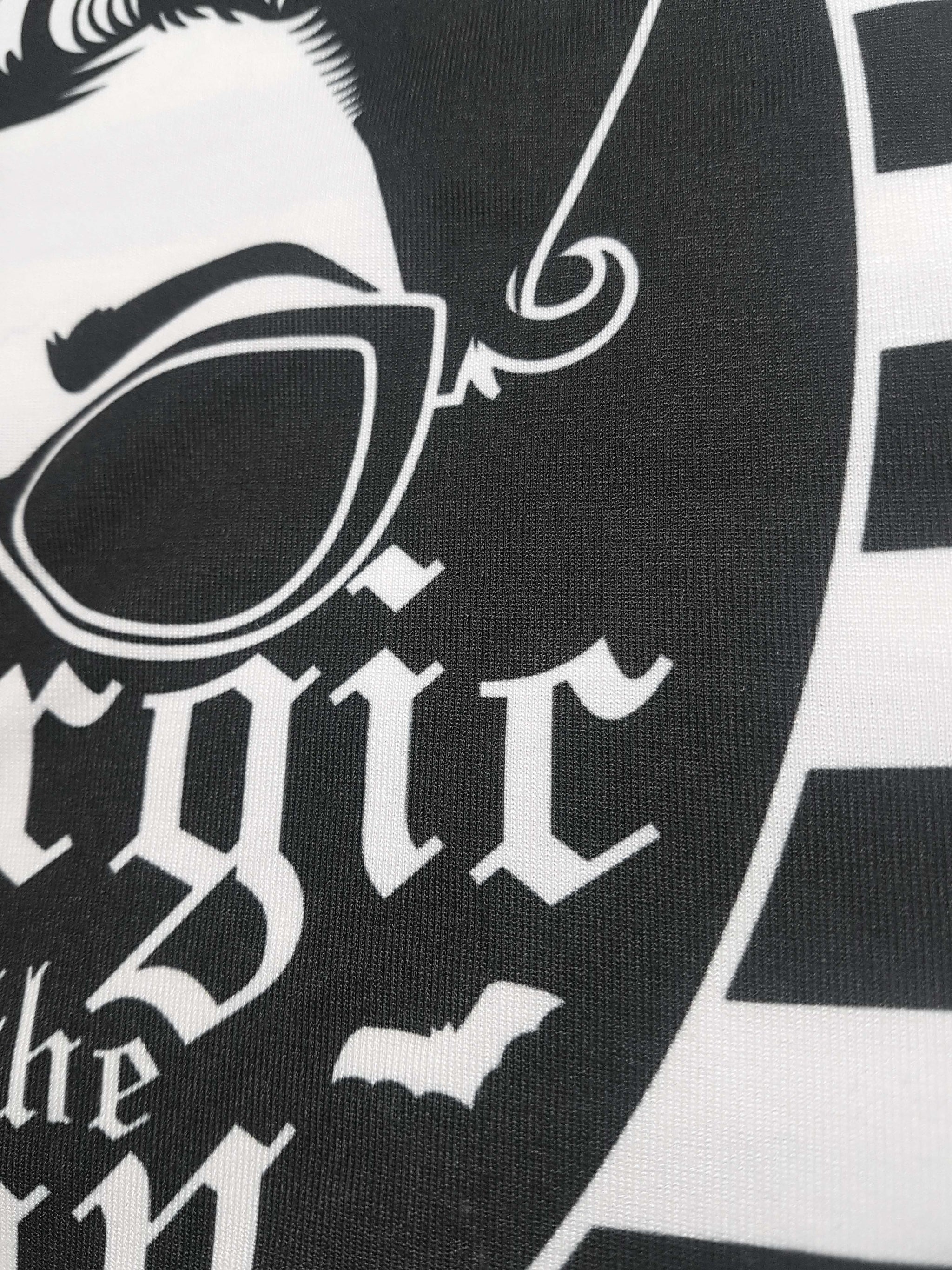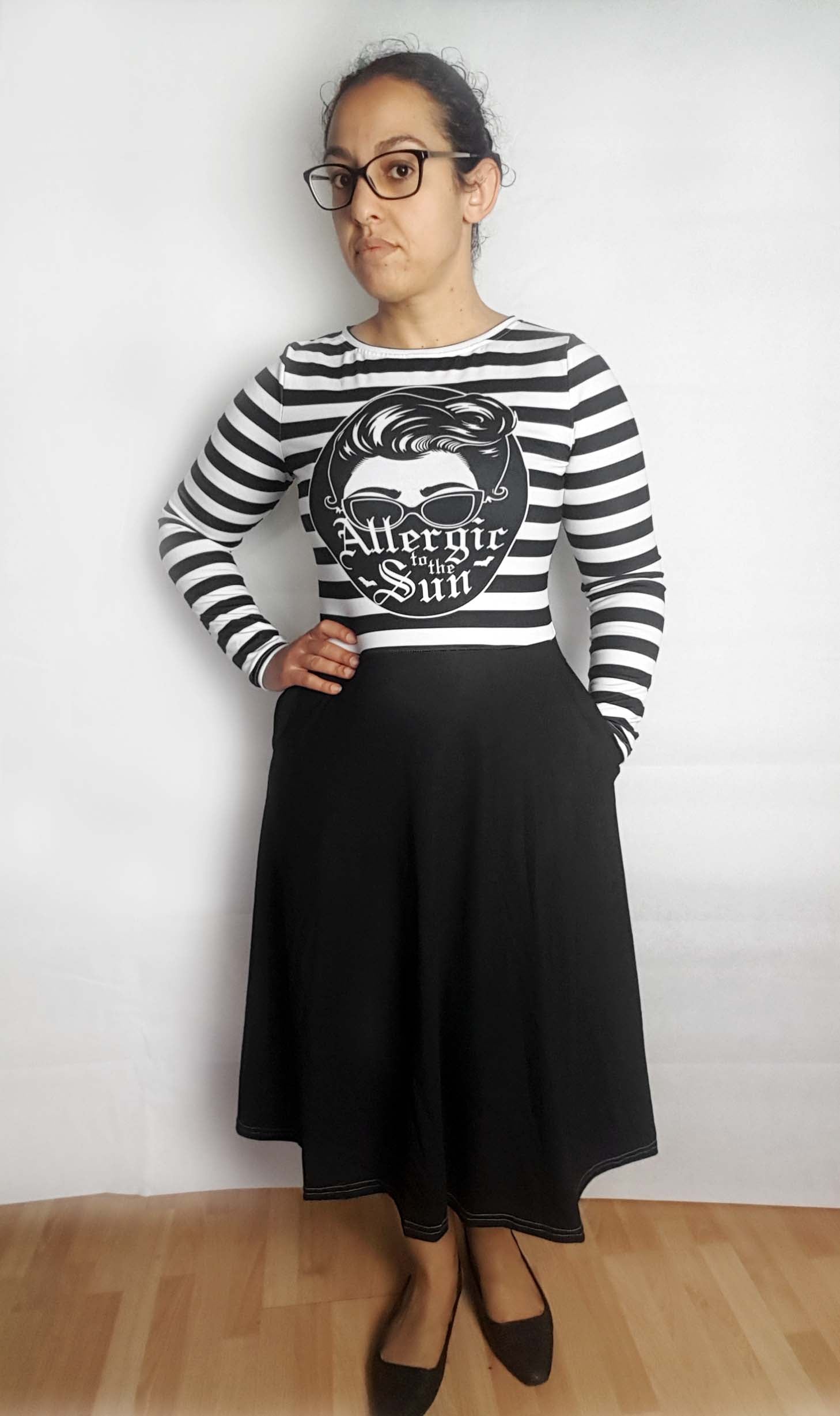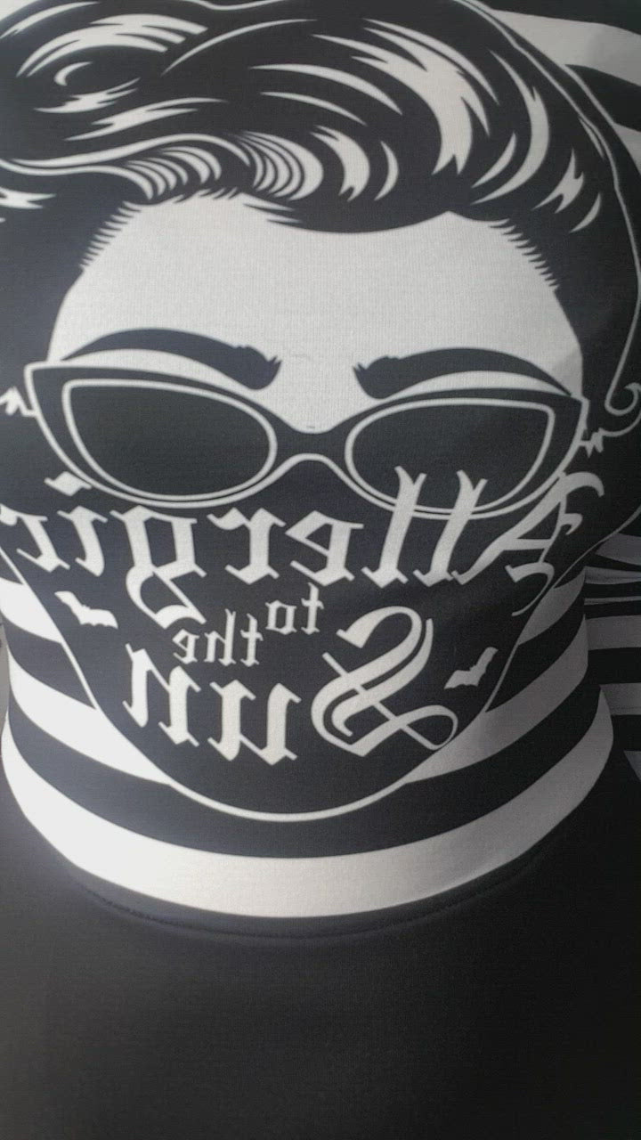 The top is decorated with a retro 1940s-50s style pin up ghoul wearing cat-eye sunglasses, tiny bats and the slogan "Allergic to the sun".