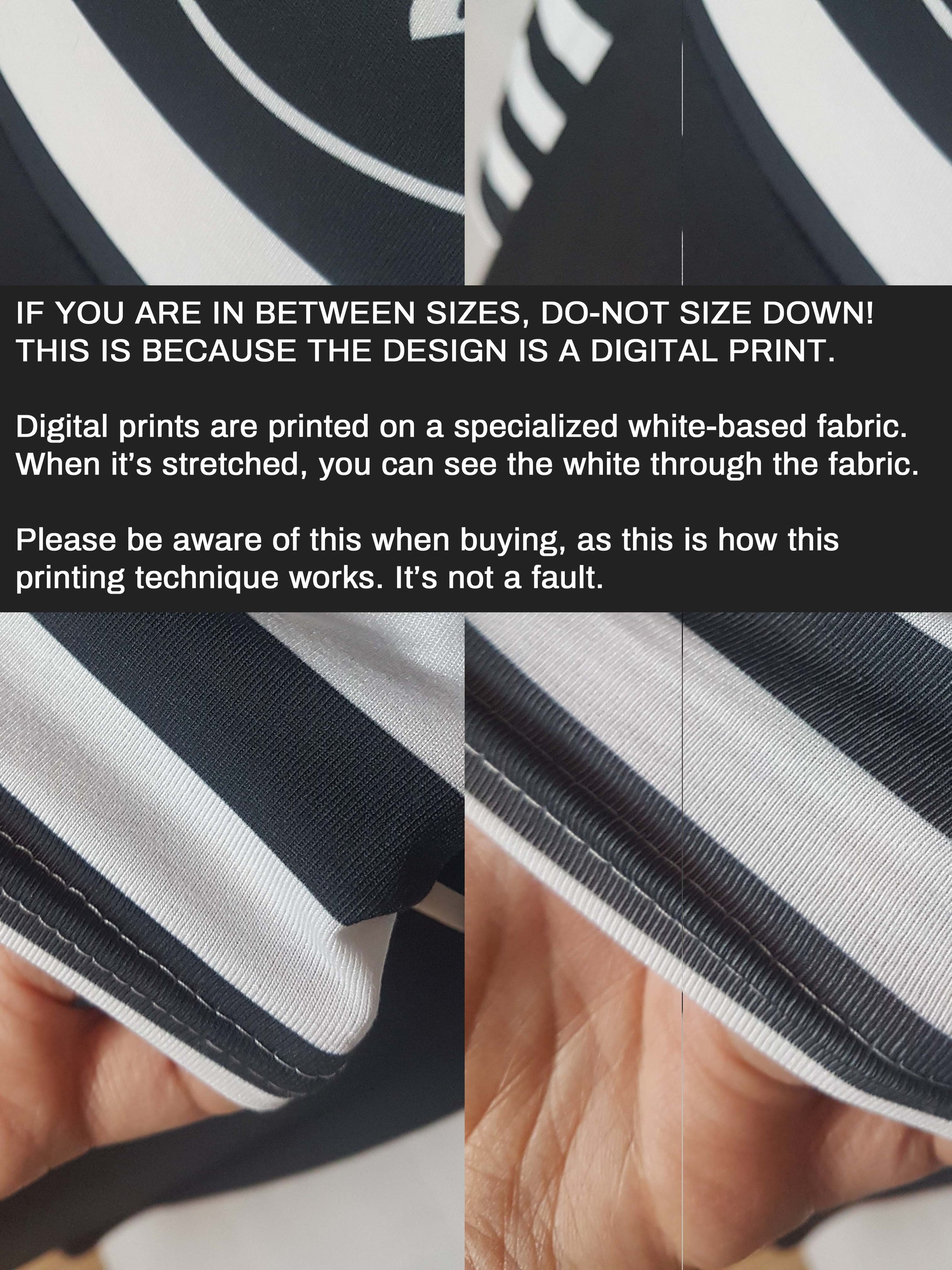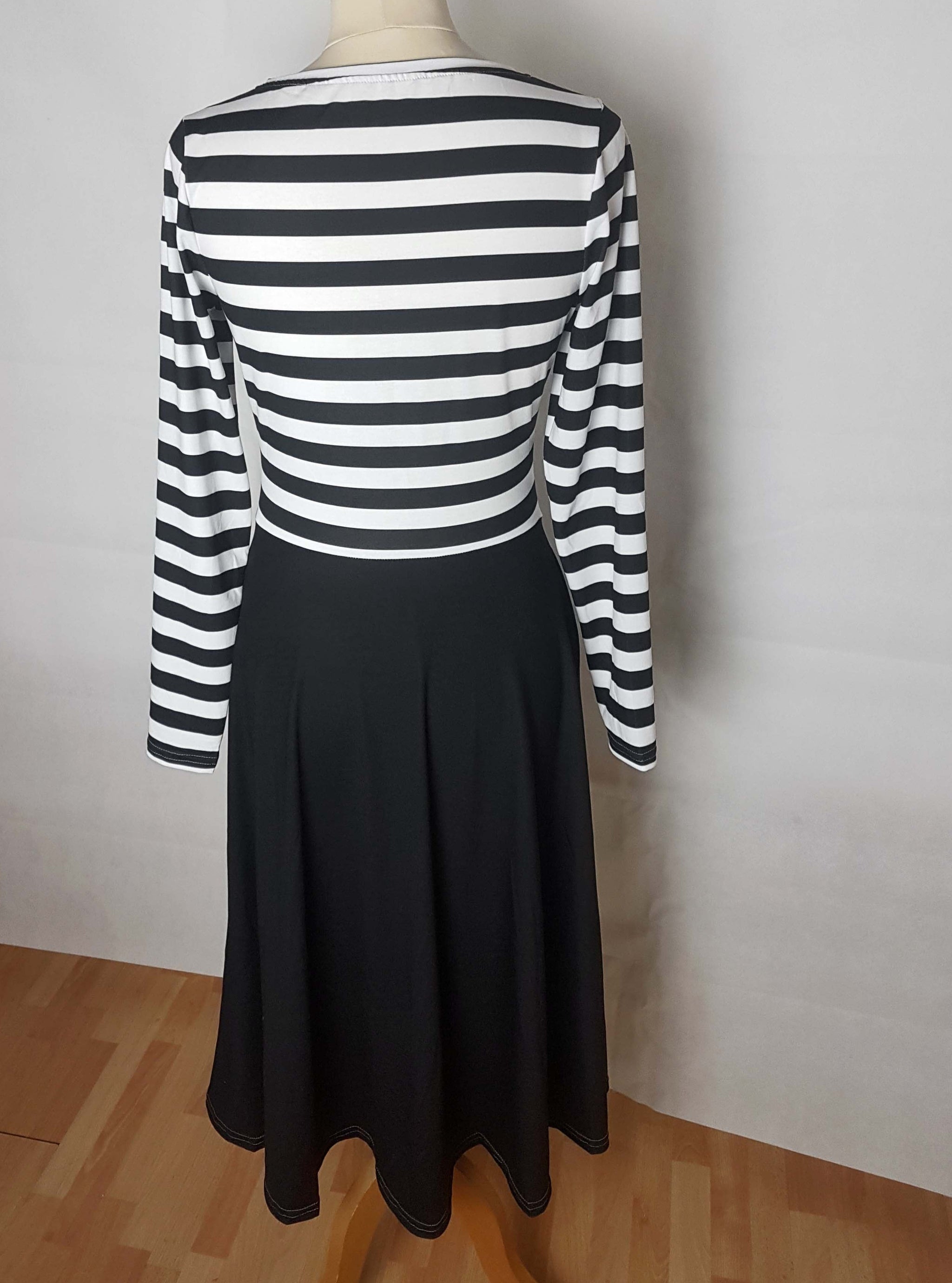 Featuring a graphic black&white striped top with long sleeves and black skirt.