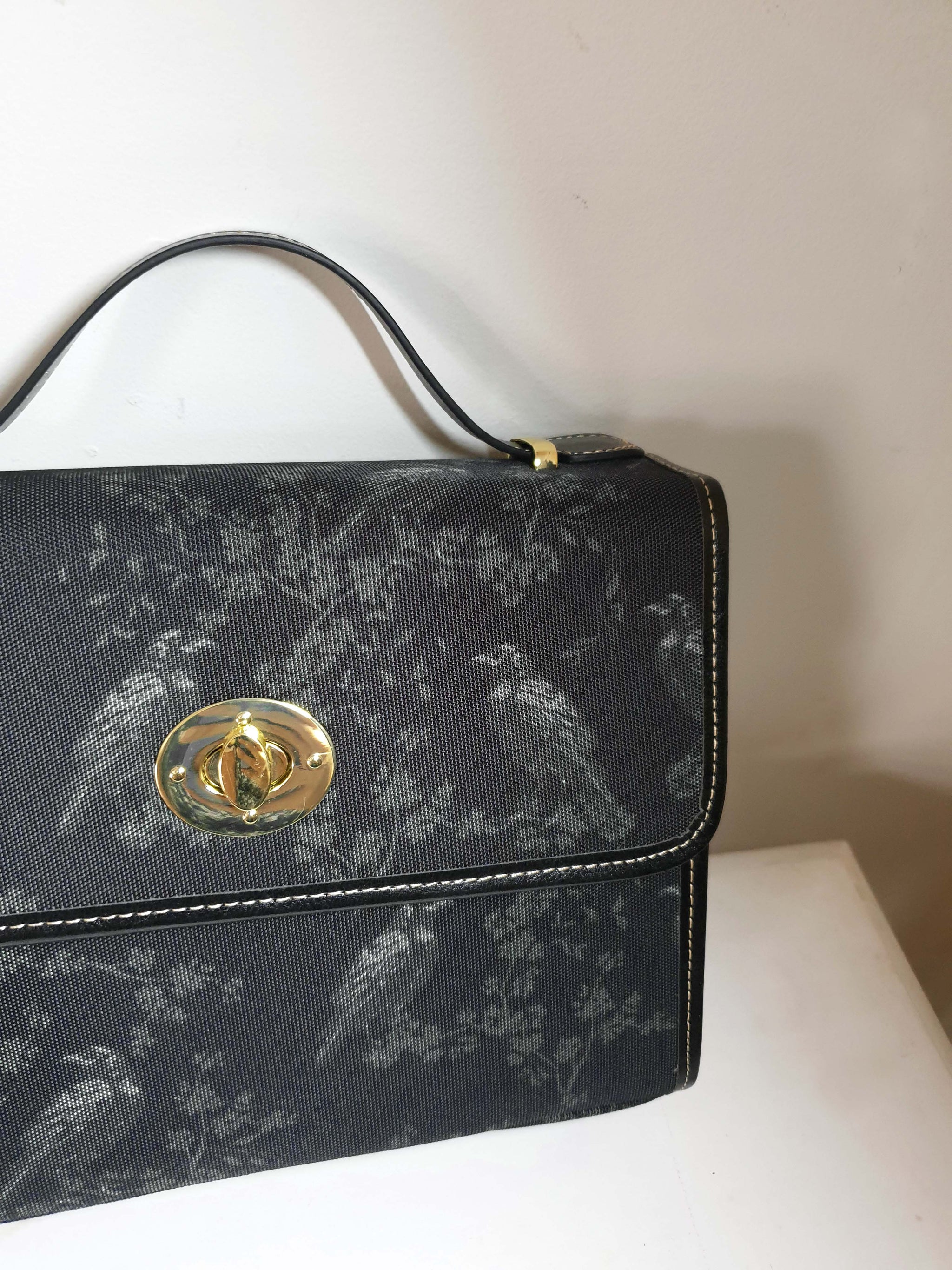 Made of high-quality canvas fabric and faux leather (PU). Featuring a very subtle ravens & blossoms print and a long crossbody strap. This deceptively roomy bag will safely hold your purse, wallet, phone and other daily essentials including a small foldable umbrella or a small tablet!