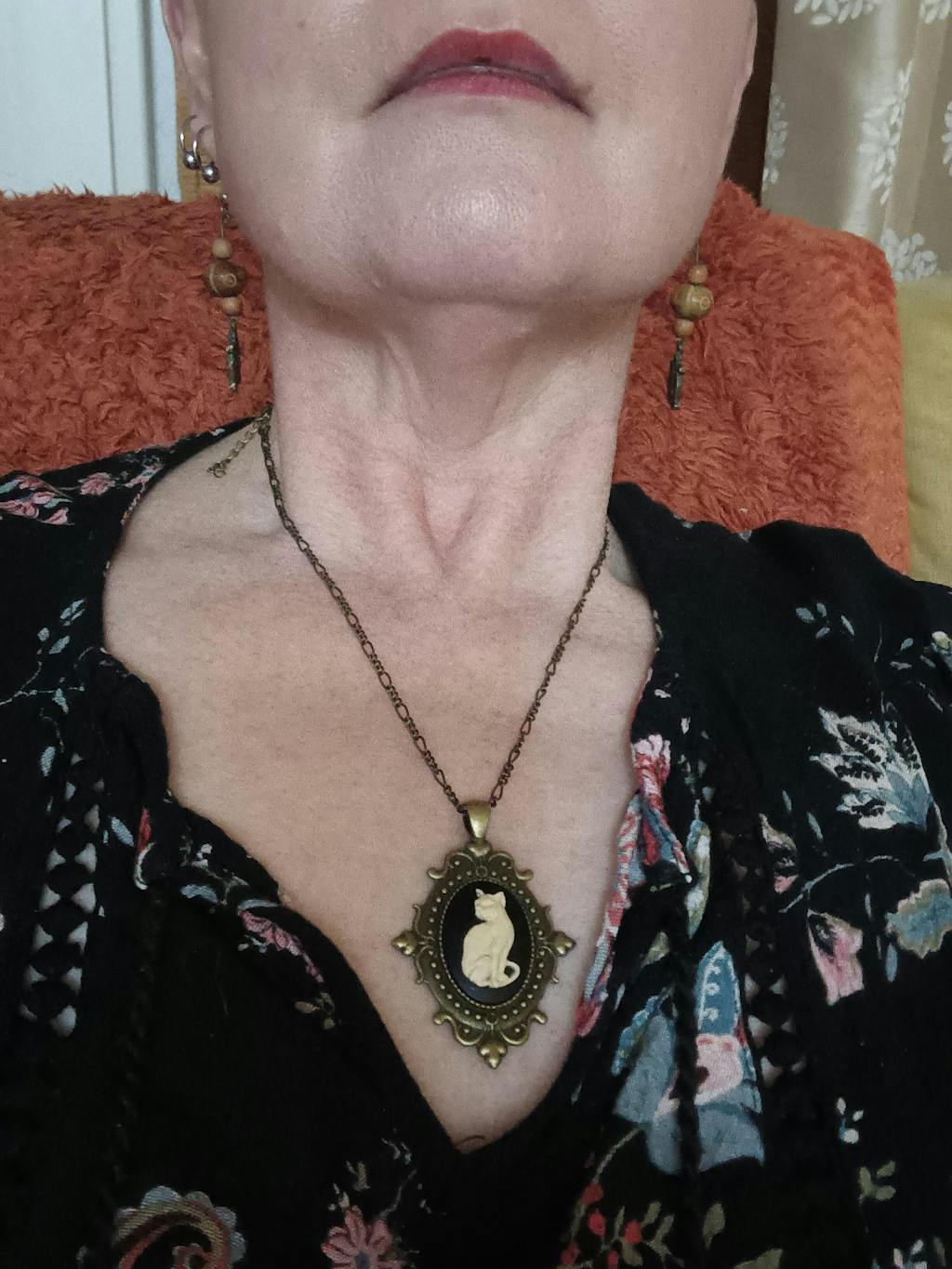 Beautiful and intricate, this Vintage style necklace features a delicate cat cameo set in an ornate Gothic pendant. Prettily detailed, you can see the cat's eyes and hair texture on the silhouette.