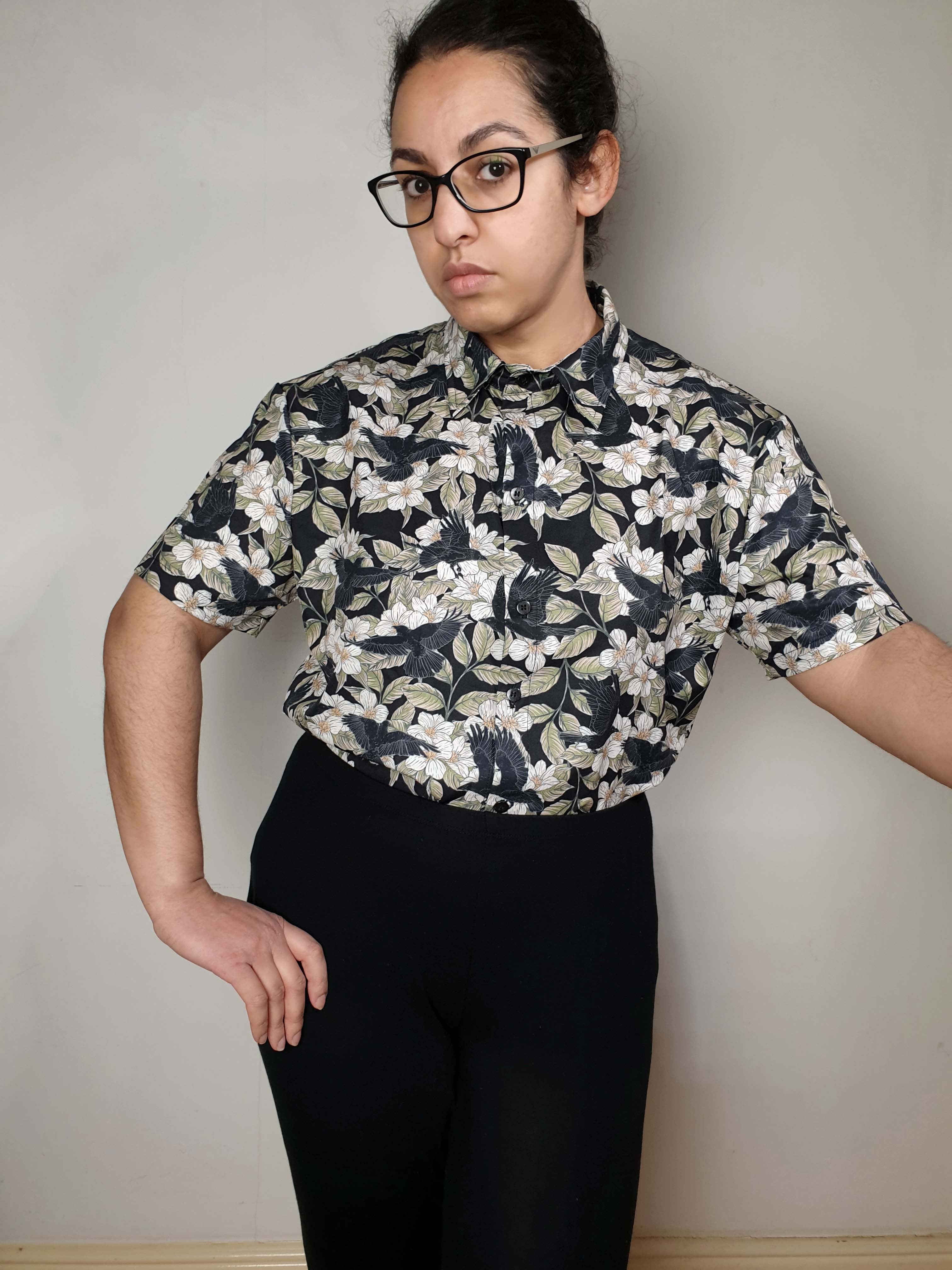 This short-sleeve collared shirt is made from soft, flowy fabric and showcases a beautiful spring floral print with flying ravens/crows. It can be worn casually with leggings for a relaxed vibe, or tucked into bottoms for a more refined, smart look.