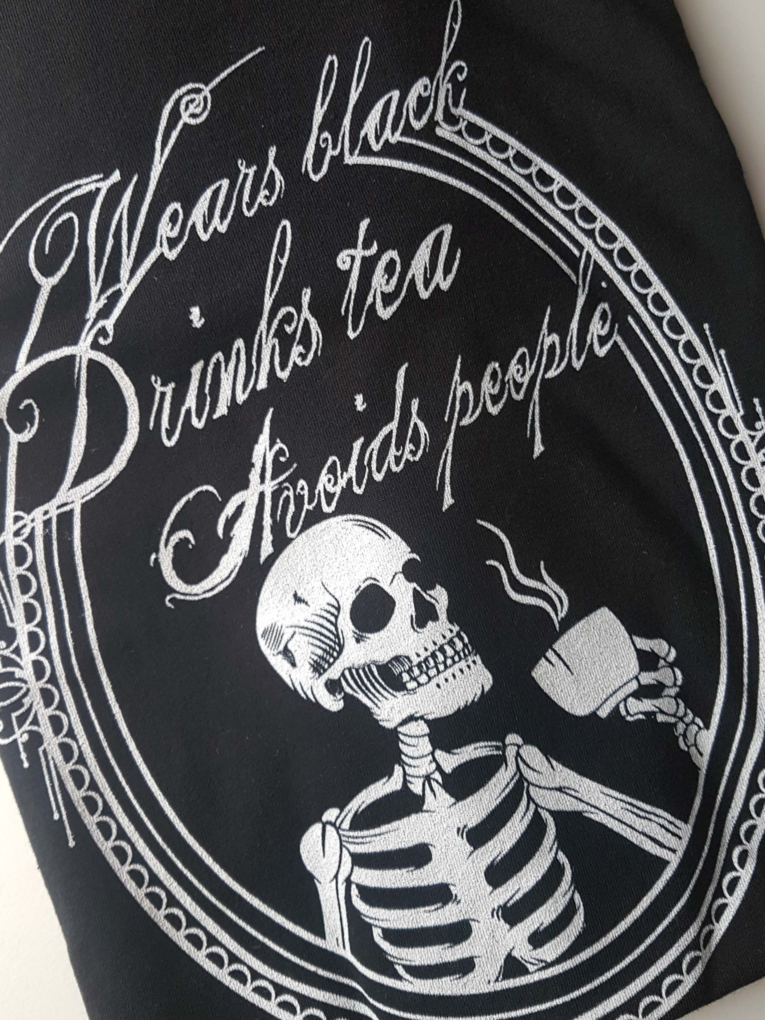This soft, V-neck tshirt features elegant Vintage-style calligraphy text, and a cheeky skeleton skull drinking from a cup with the slogan "Wears black, drinks tea, avoids people".
