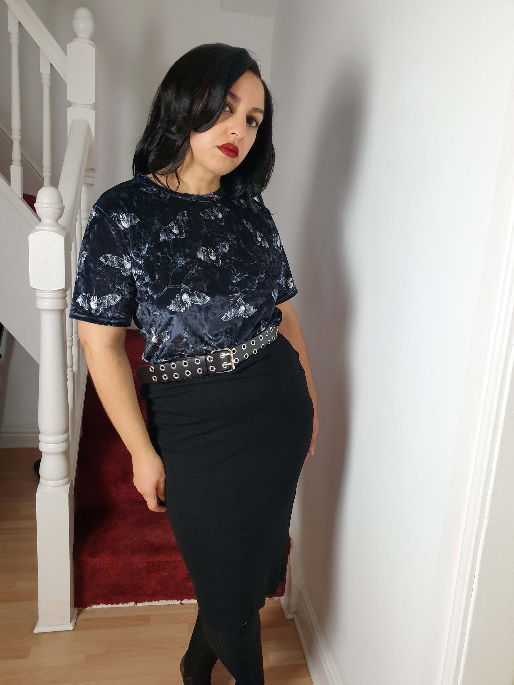 Add a sweet touch of darkness to your black wardrobe with this black velvet tshirt. Long enough to be worn over your leggings or tucked in for a smarter look. The print features a midnight scene of adorable flying bats against a delicate background of tree branches and blossoms.