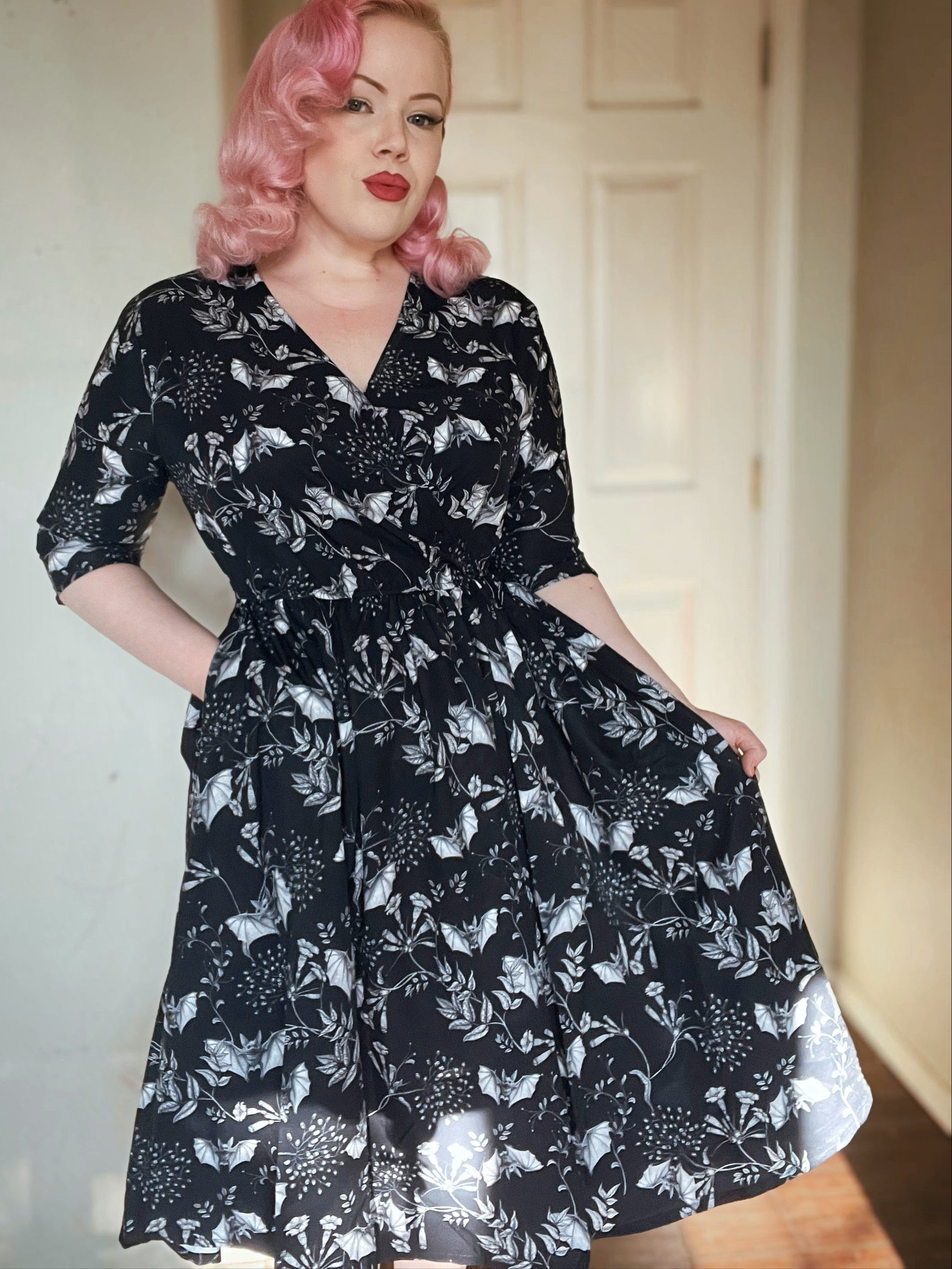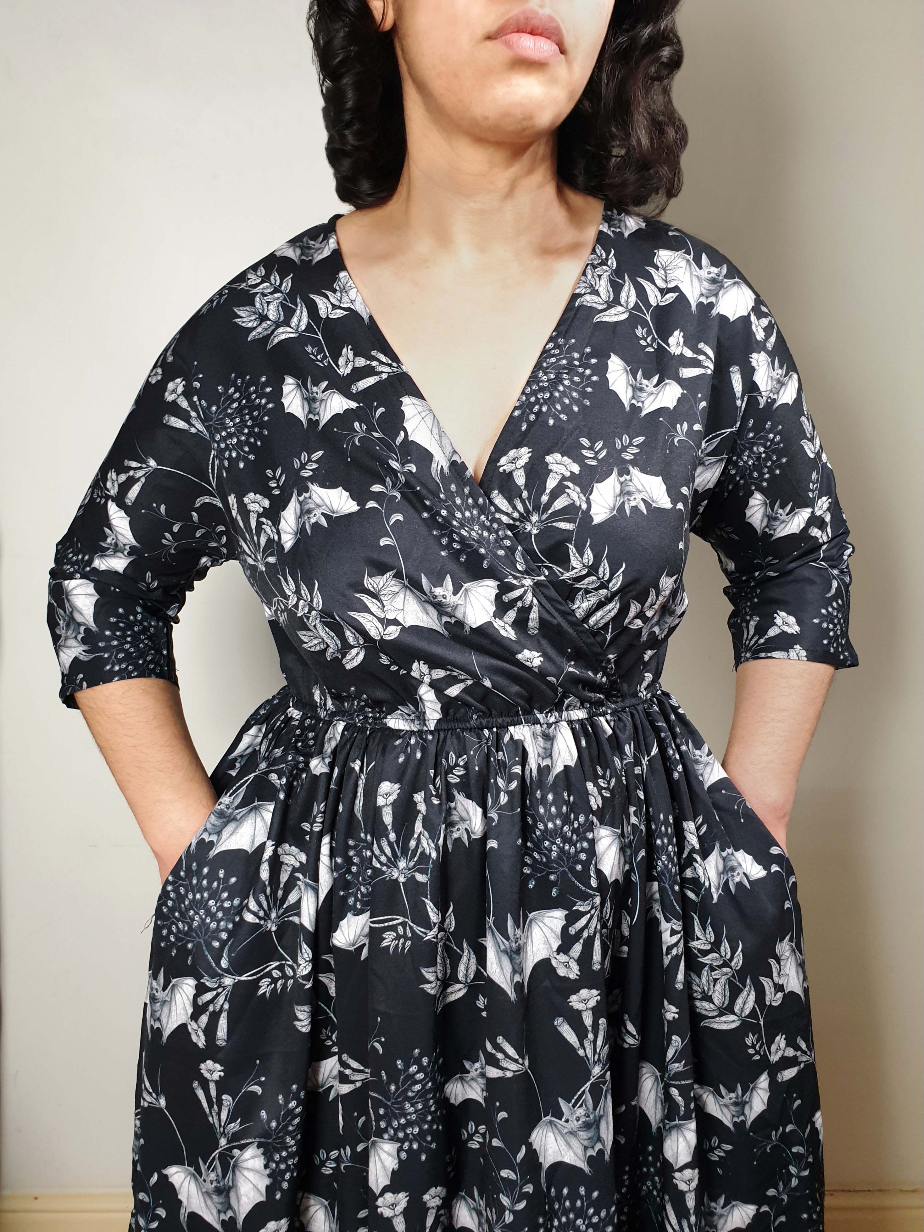 WRAP-FRONT MIDI DRESS (Botanical Bats print)