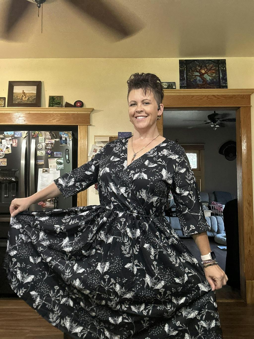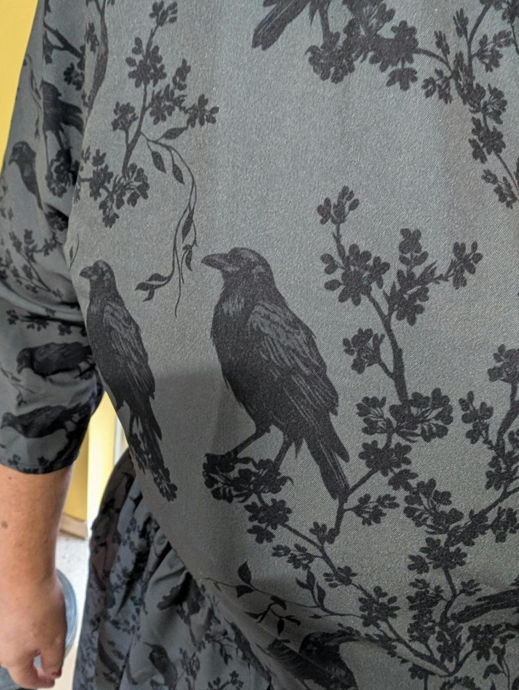 WRAP-FRONT MIDI DRESS (Black Ravens & Blossoms)